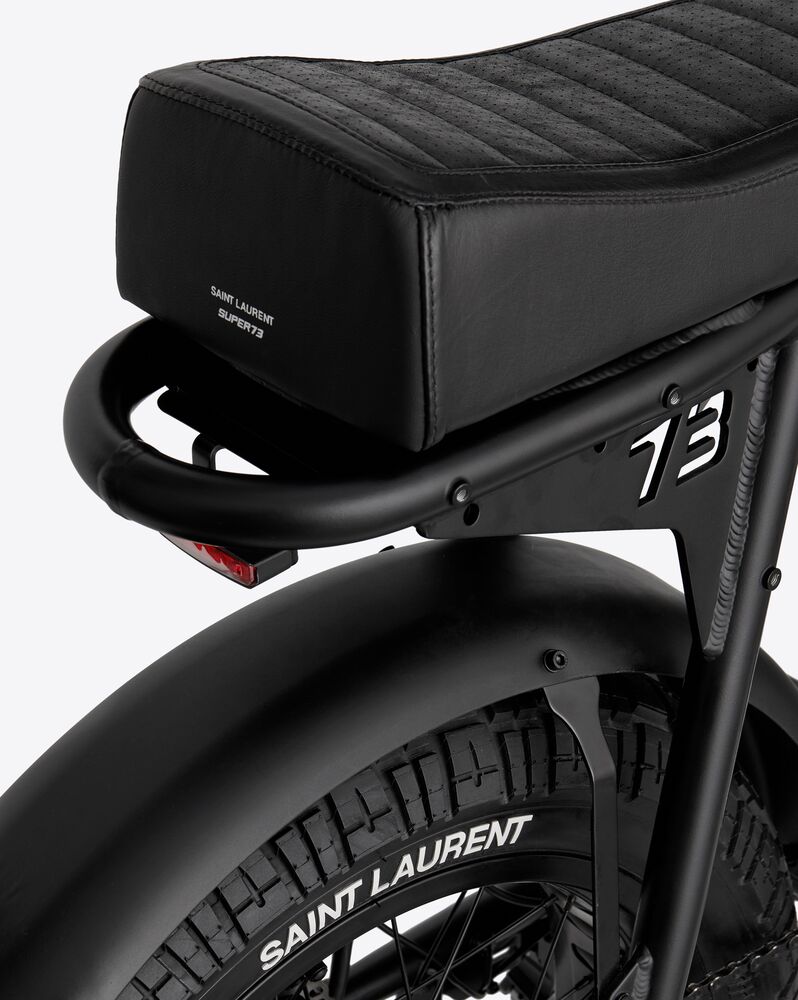 Na pierwszy plan wybija się matowa czerń pokrywająca cały rower. Rama powstała ze stopu aluminium 6065/7071 klasy lotniczej, więc jest lekka, sztywna i odporna na korozję. Fotele, zakończenia uchwytów na kierownicy oraz łańcuch wykonane zostały na zamówienie. Nie można nie zauważyć kontrastujących na biało nazw obu brandów na ramie, oponach i siedzeniu. Duet Saint Laurent&SUPER73 jest przez to bardzo widoczny. Ponadto na każdym kroku dostrzegamy dbałość o detale, co bardzo ceni się w nietypowych projektach.